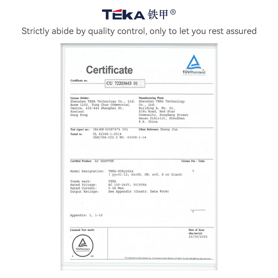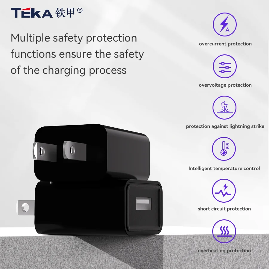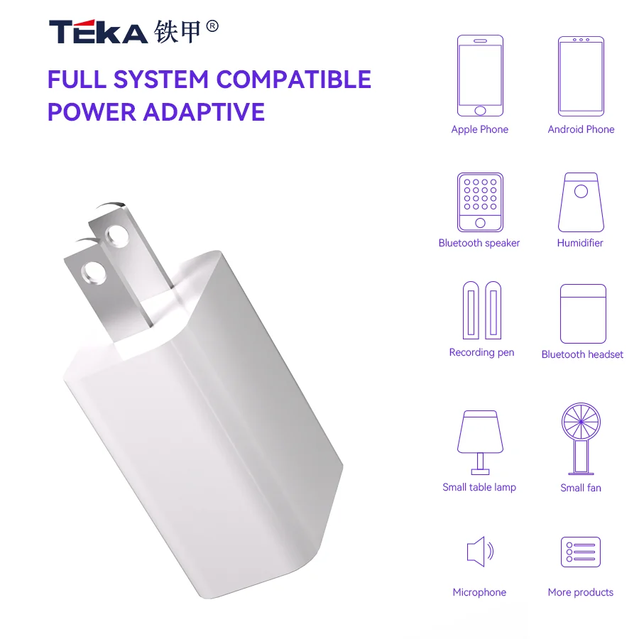The teka-uca20us charger is a compact and portable diversified charger with a wide input range of 100-240v ~ 50/60 hz 0.35 a max, suitable for global use. it offers a dedicated output of 5.0 v-2. 0a for stable and efficient charging. made using fire and flame retardant pc 94v0 material, safety and reliability are ensured. available in black or white, fcc/ul certified to meet safety standards. upgrade your charging experience with this convenient and efficient 5v2a usb charger.